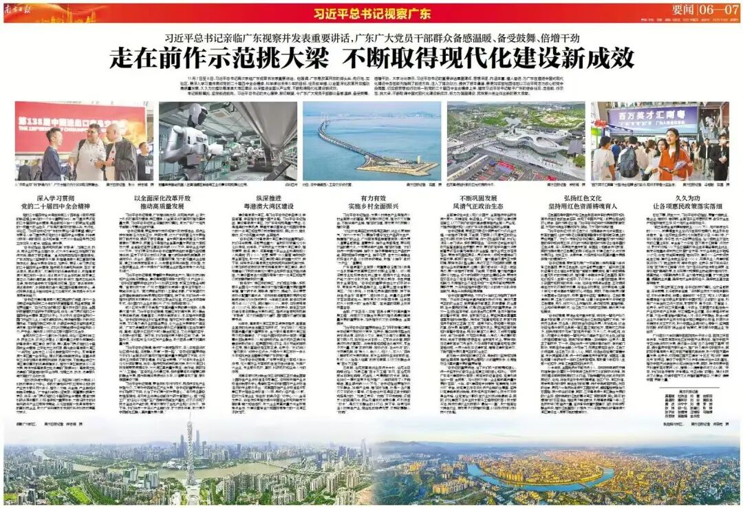 11月7日至8日,习近平总书记再次亲临广东视察并发表重要讲话。他强调,广东是改革开放的排头兵、先行地、实验区,要深入学习宣传贯彻党的二十届四中全会精神,科学谋划未来5年的目标、任务和举措,以全面深化改革开放推动高质量发展,久久为功推动粤港澳大湾区建设,纵深推进全面从严治党,不断取得现代化建设新成效。