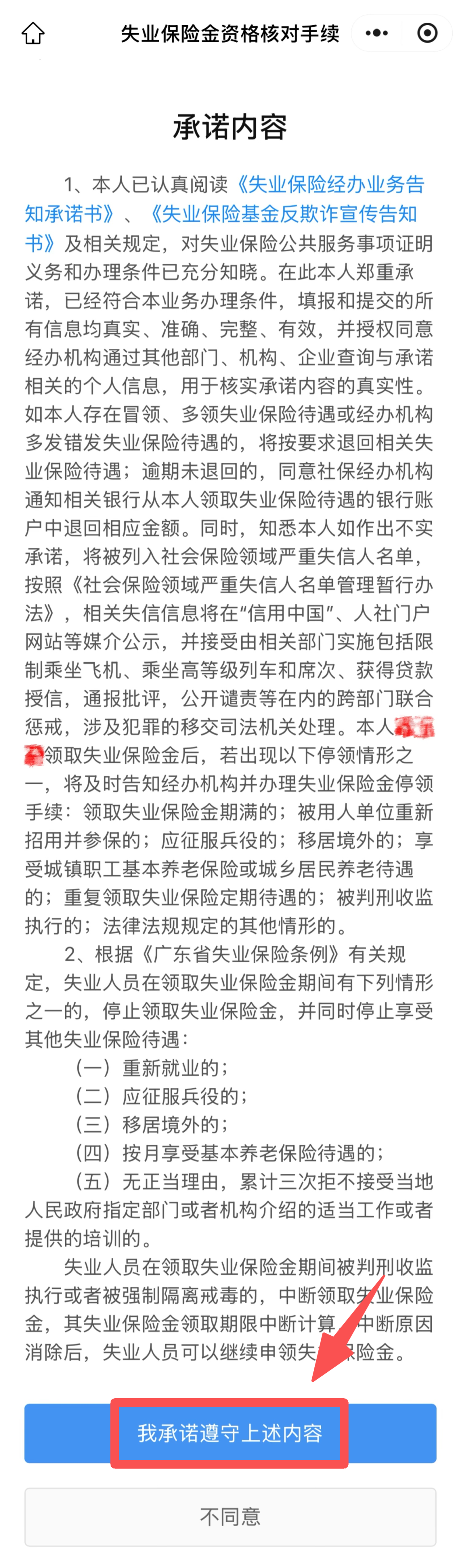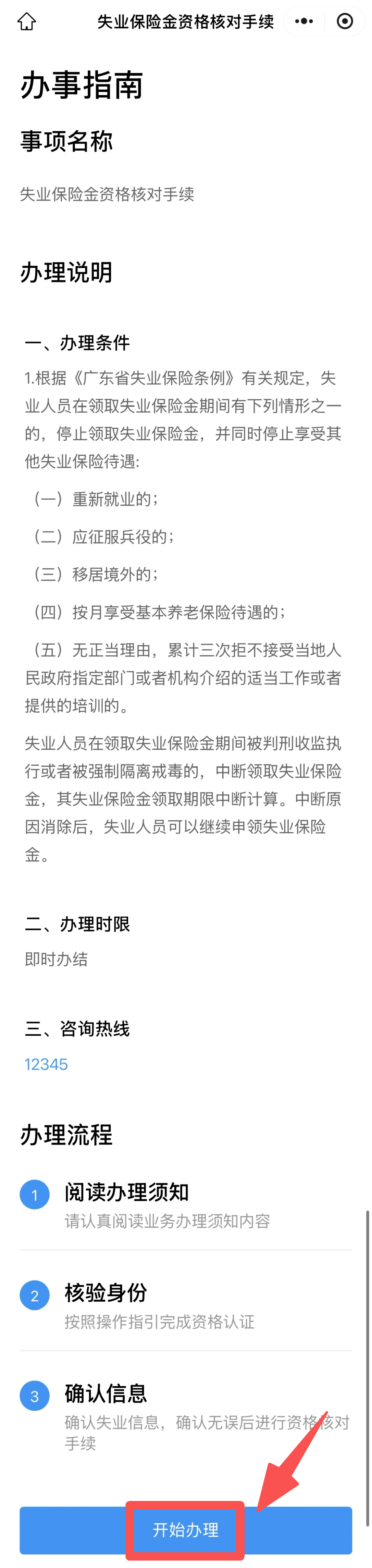 完成授权登录后,进入“失业保险金资格核对手续”页面。在办理页面,阅读办事指南后,点击页面下方“开始办理”,按操作指引确认“承诺内容”。