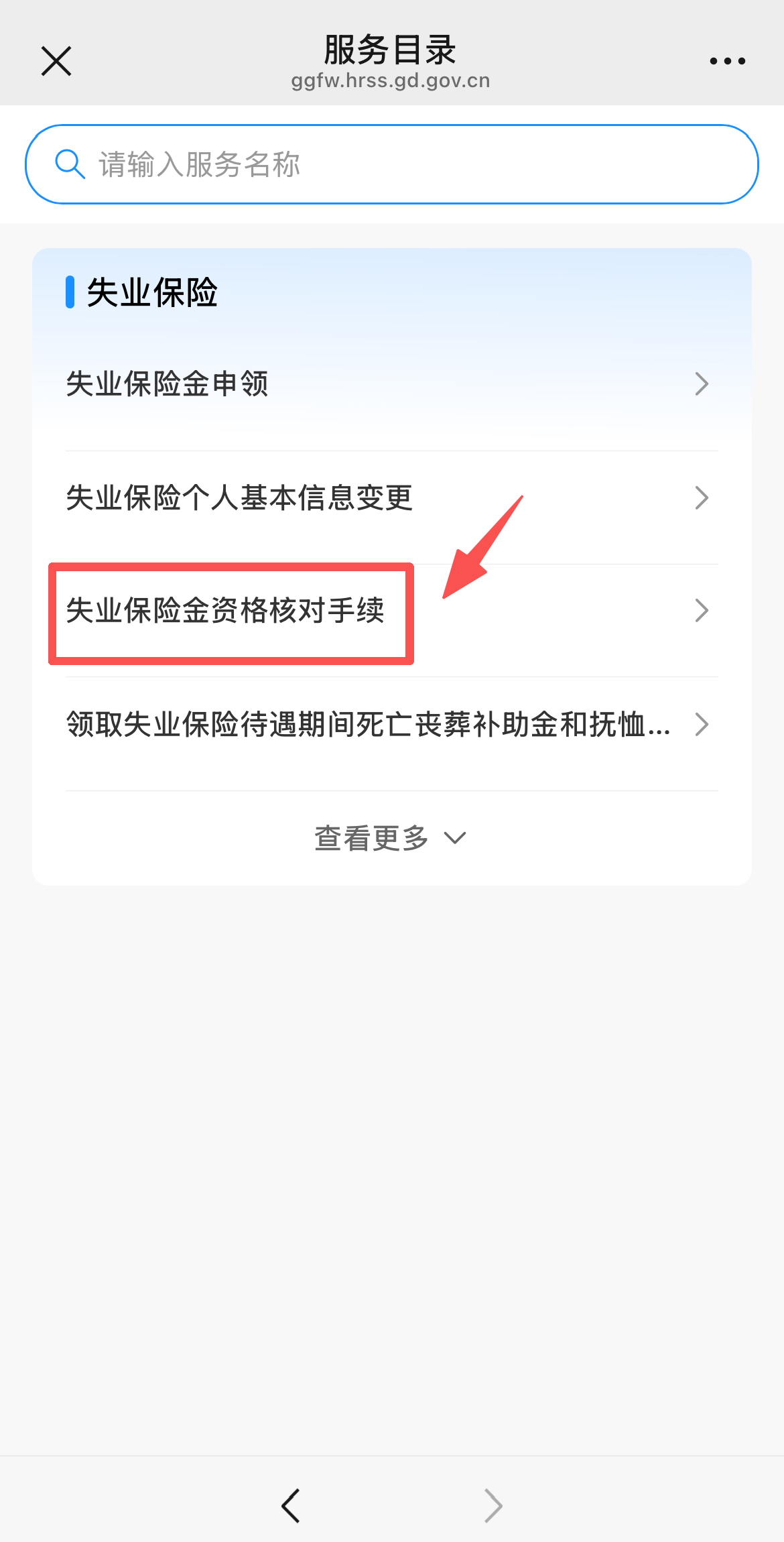 进入“失业保险”页面,点击“失业保险金资格核对手续”。点击“允许”跳转办理页面。