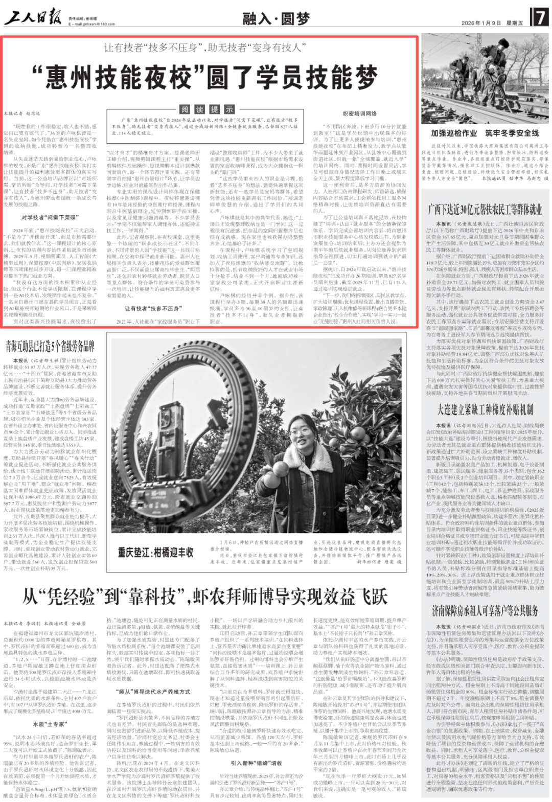 广东“惠州技能夜校”自2024年底启动以来,对学技者“问需下菜碟”,让有技者“技多不压身”,助无技者“变身有技人”,通过全域培训网络+全链条就业服务,已帮助827人结业、114人稳定就业。请看工人日报报道《“惠州技能夜校”圆了学员技能梦》。