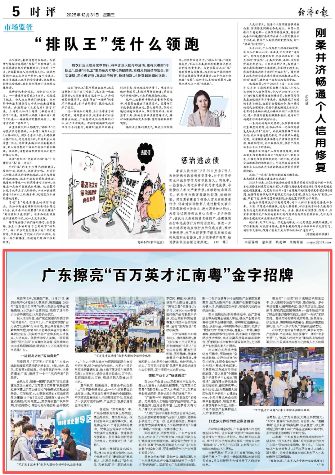 12月27日至28日,“百万英才汇南粤”2025年秋季大型综合招聘会在深圳举行。广东这场引才“压轴大戏”,不仅体现其以一条贯穿全年、不间断的引才主线,串联起综合招聘与专场引才、集中招引与长期布局,更是广东擦亮“百万英才汇南粤”金字招牌、在更长周期内为高质量发展持续蓄能的有力见证。请看经济日报报道《广东擦亮“百万英才汇南粤”金字招牌》。