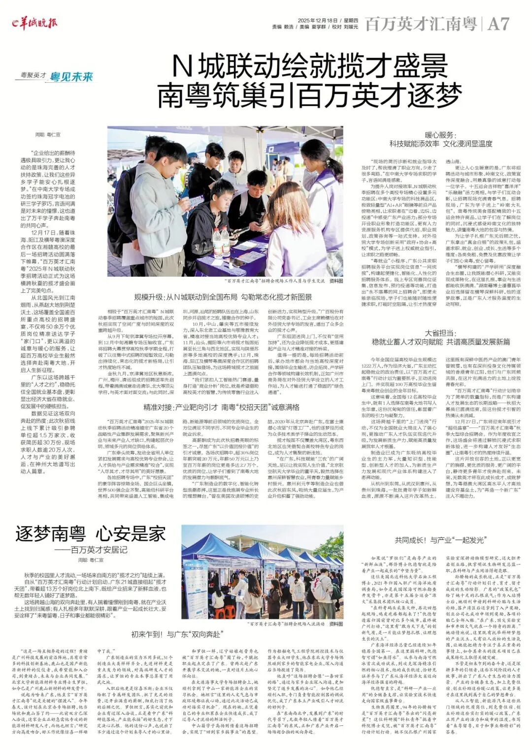 12月17日,随着最后一批跨省引才团队的满载而归,“百万英才汇南粤”2025年N城联动秋季招聘活动圆满收官。这场跨越三个多月、覆盖全国19个省(直辖市)、走进逾100所重点高校的引才行动,以一份沉甸甸的“人才成绩单”,勾勒出全年招才引智的主线图谱,也为稳就业、强产业、育新质生产力提供了持续而有力的人才支撑。请看羊城晚报报道《N城联动绘就揽才盛景,南粤筑巢引百万英才逐梦》。