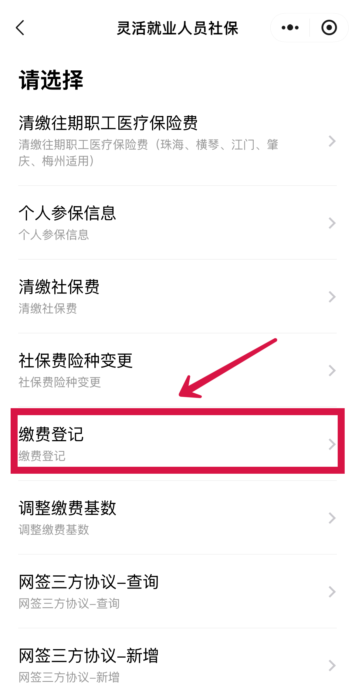 进入“粤税通”微信小程序并登录,点击首页“灵活就业人员社保”,点击“缴费登记”,即可进入办理页面。