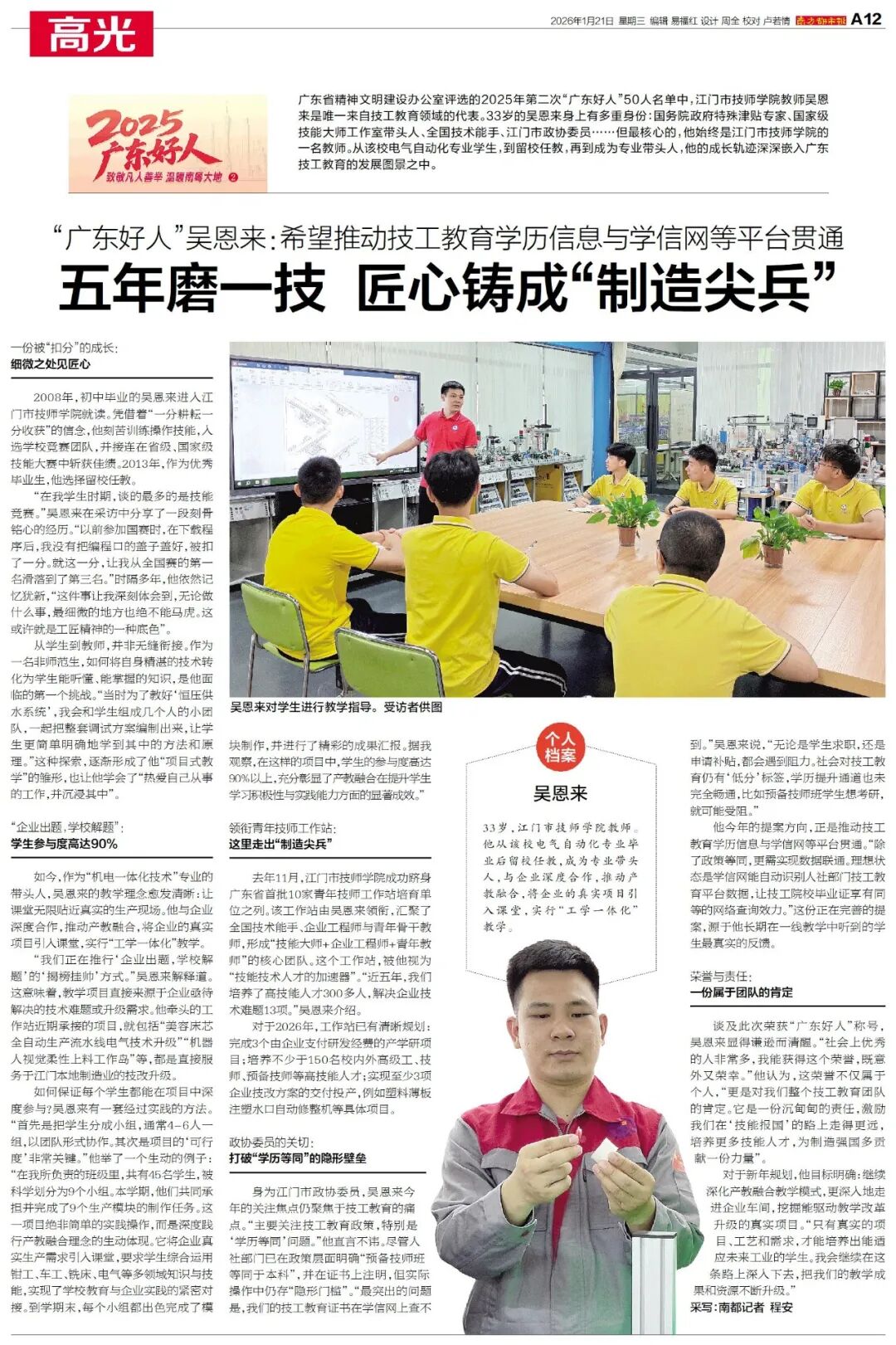 谈及此次荣获“广东好人”称号,吴恩来显得谦逊而清醒。“社会上优秀的人非常多,我能获得这个荣誉,既意外又荣幸。”他认为,这荣誉不仅属于个人,“更是对我们整个技工教育团队的肯定。它是一份沉甸甸的责任,激励我们在‘技能报国’的路上走得更远,培养更多技能人才,为制造强国多贡献一份力量”。