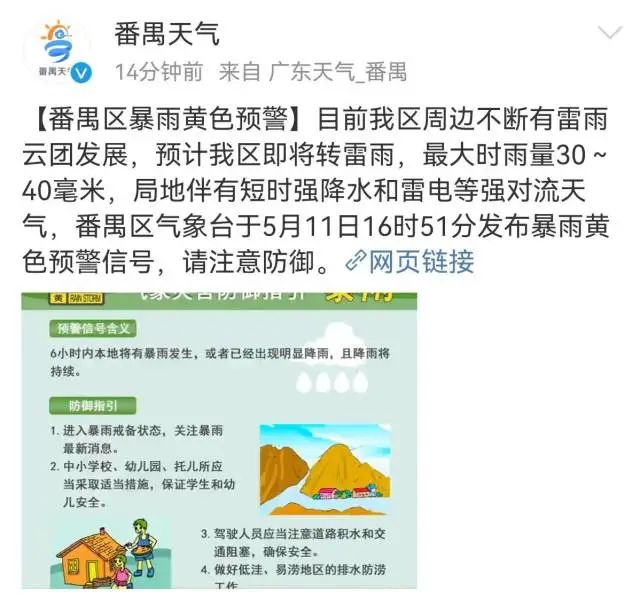 5月11日16时53分,番禺区气象台发布了暴雨黄色预警:目前番禺周边不断有雷雨云团发展,预计番禺即将转雷雨,最大时雨量30~40毫米,局地伴有短时强降水和雷电等强对流天气,番禺区气象台于5月11日16时51分发布暴雨黄色预警信号,请注意防御。