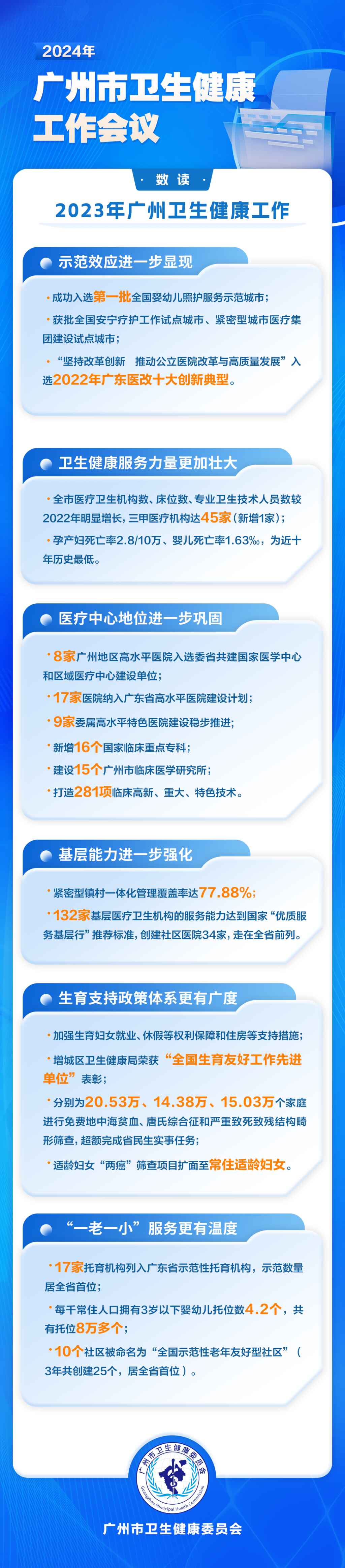 会议指出,2023年是全面贯彻落实党的二十大精神的开局之年,省委省政府、市委市政府相继出台《关于推进卫生健康高质量发展的意见》《关于推进卫生健康高质量发展的实施意见》,卫生健康高质量发展蹄疾步稳。成功入选第一批全国婴幼儿照护服务示范城市,获批全国安宁疗护工作试点城市、紧密型城市医疗集团建设试点城市,“坚持改革创新 推动公立医院改革与高质量发展”入选2022年广东医改十大创新典型,检验检查结果互认取得扎实成效,居民健康指标保持全国前列。扎实开展主题教育,深化党建品牌创建和廉政建设,干部精气神进一步提升。推动粤港澳规则衔接,畅通要素流动,宜居宜业的健康湾区进一步形成。抓实公立医院改革,深化综合医改,推广智慧医疗,医药卫生体制进一步重塑。推进医疗高地建设,强化基层服务能力,健全中医药服务体系,助力生物医药与健康产业发展,广州医疗特色优势进一步彰显。加速织密疾控体系,提升监测预警和应急处突效能,有效开展重大疾病防治行动,公共卫生工作基础进一步夯实。深入开展健康广州行动,完善生育支持政策体系,优化“一老一小”服务,全生命周期服务体系进一步完善。卫生健康法治体系不断完善,人才队伍结构更加优化,创新能力不断增强,卫生健康事业强支撑进一步强化。监管力度持续加大,政务服务更加便捷,安全基石更加稳固,各项管理服务水平进一步提升。