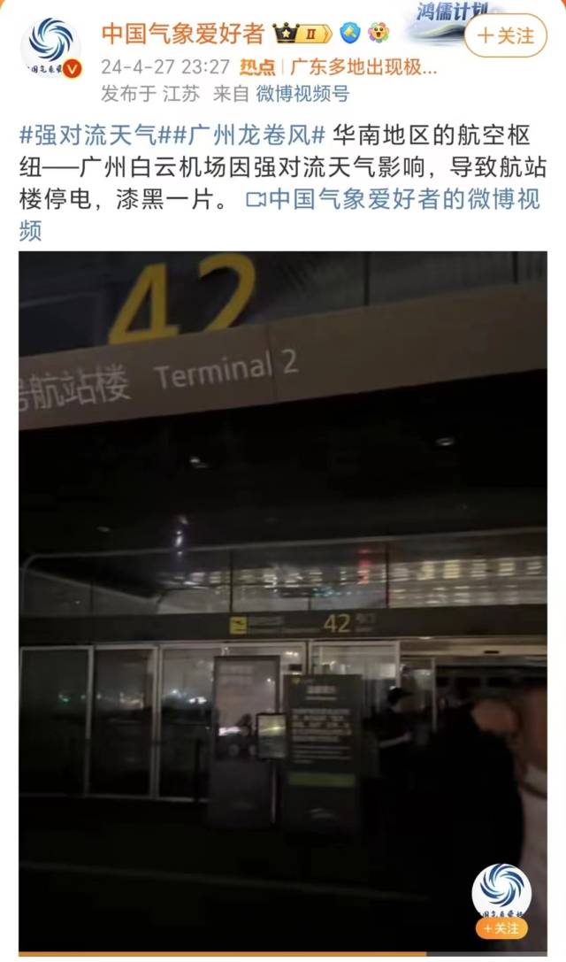 4月27日深夜11时许,一则强对流天气导致广州白云机场停电的消息在网络上流传。网传图片显示,白云机场T2航站楼漆黑一片。多位网友也在社交媒体上发布了白云机场停电的相关消息。