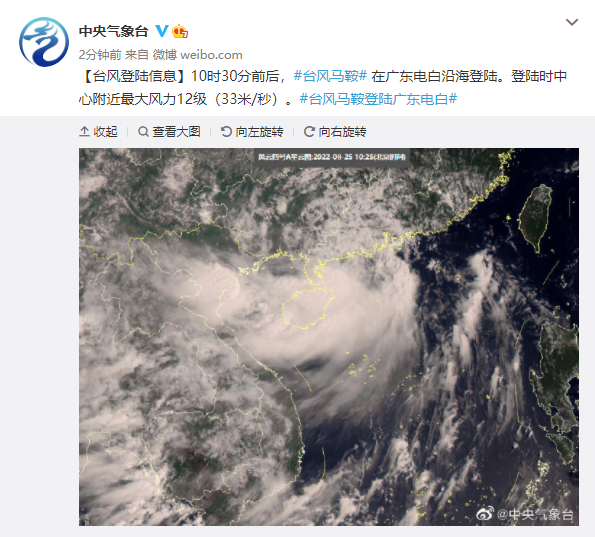 中央气象台消息,10时30分前后,台风“马鞍”在广东电白沿海登陆。登陆时中心附近最大风力12级(33米/秒)。