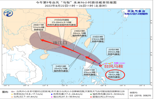 8月22日,广州市三防总指挥部办公室组织市气象局、省水文局广州水文分局对广州市未来七天的气象水文情况进行了会商,22至23日,受副热带高压加强影响,广州以高温炎热为主,最高气温35℃左右。24日,天气趋不稳定,雷雨活跃。25至26日,受台风“马鞍”影响,广州将有一次明显的大风和降水过程,25日港区、沿海及高地最大阵风可达10~12级,8级大风持续约16小时。过程累积雨量:南部120~180毫米,局部超过200毫米,中部40~80毫米;北部30~70毫米;最大小时雨强:40~60毫米,局部70~80毫米;最强降水时段:25日中午至26日凌晨。
