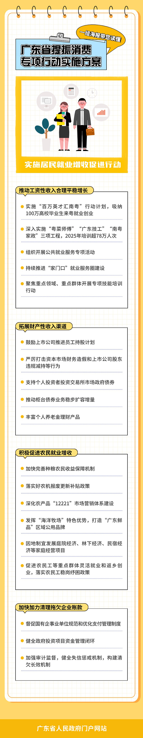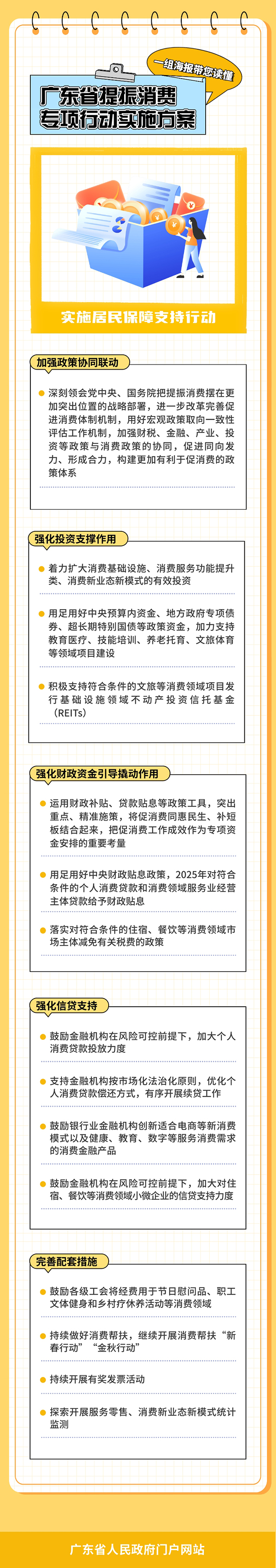 近日,广东省人民政府办公厅印发《广东省提振消费专项行动实施方案》(以下简称《方案》),推出8个方面、31条举措,部署实施居民就业增收促进行动、居民保障支持行动、服务消费提质惠民行动、大宗消费更新升级行动等七大行动,多方面综合施策,千方百计提振消费。一组海报带您读懂《方案》: