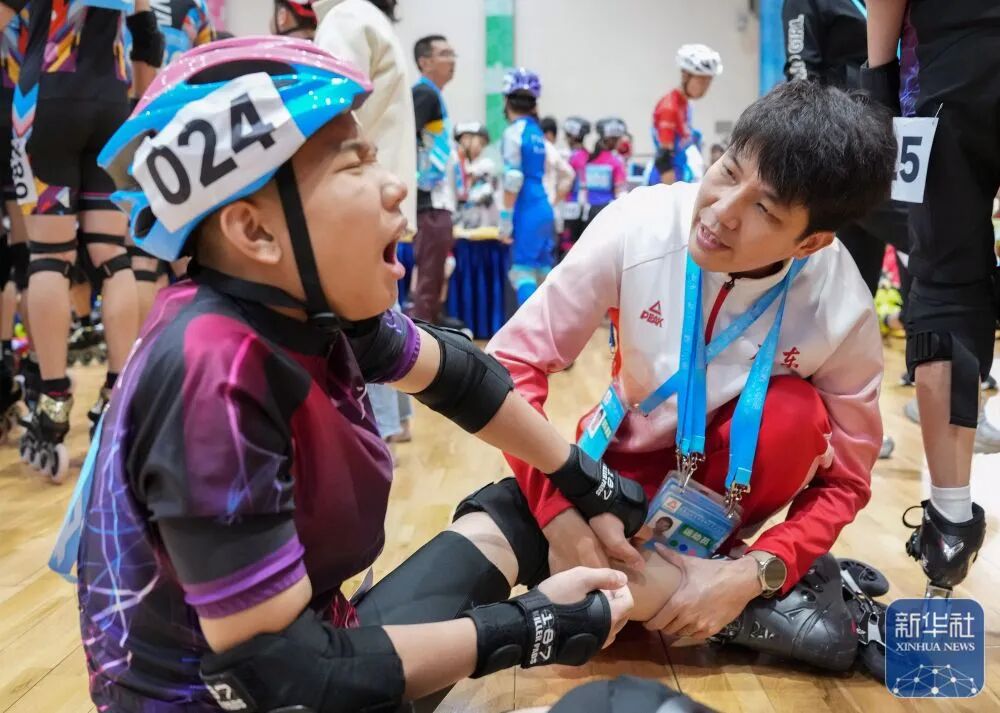 ↑12月11日,在全国第十二届残疾人运动会暨第九届特殊奥林匹克运动会特奥轮滑项目比赛现场,广东一团队教练在场边帮助队员许腾(左)放松肌肉。新华社记者 马金瑞 摄