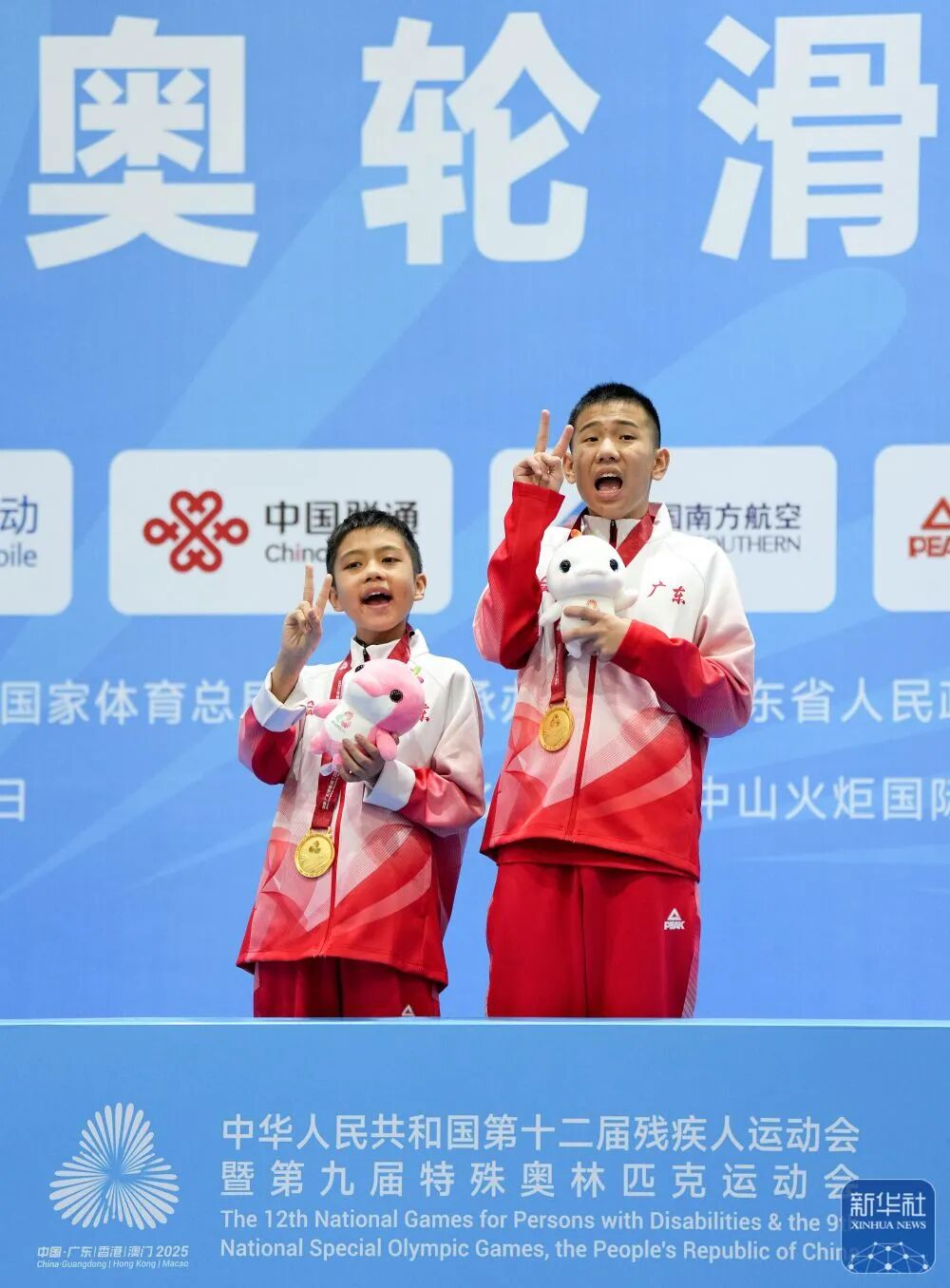 ↑12月11日,广东一团队选手许腾(右)和队友张峻在颁奖仪式上合影。他们夺得全国第十二届残疾人运动会暨第九届特殊奥林匹克运动会特奥轮滑项目男子组2x100米接力M05组冠军。新华社记者 马金瑞 摄