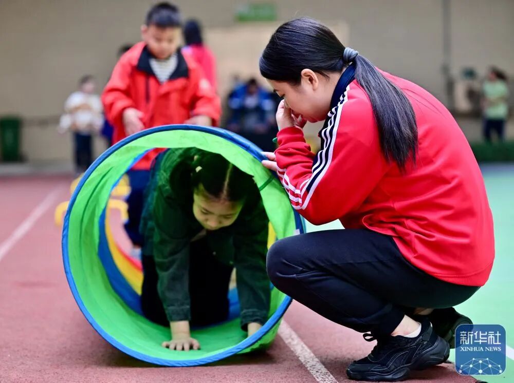 ↑12月11日,在佛山市康复实验学校,一名教师(右)辅助学生进行运动康复。新华社记者 吴青昊 摄