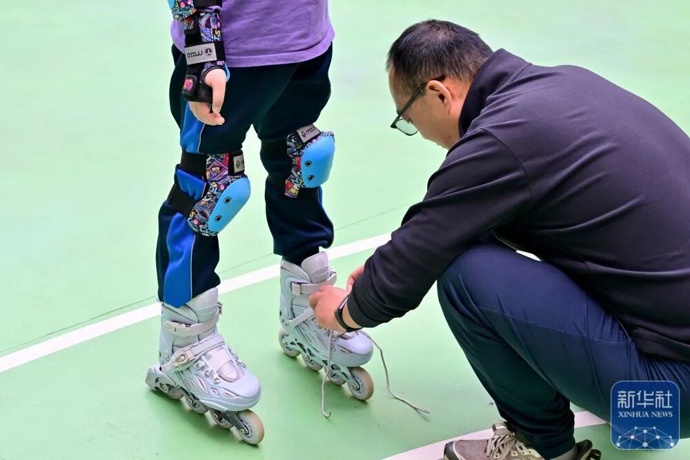 ↑12月11日,佛山市康复实验学校轮滑队指导教师为学生系鞋带。新华社记者 吴青昊 摄