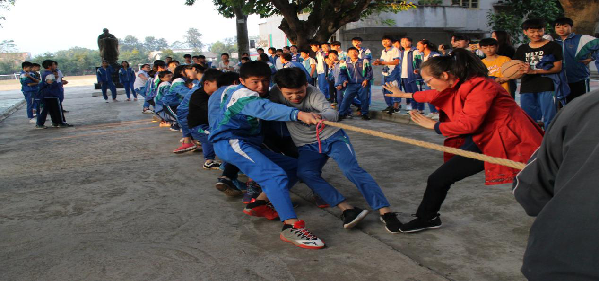 拔河比赛开始啦,纤绳两边的少年们身子一致倾斜成了一个大锐角,一个个咬紧牙关拽着纤绳,纤绳被两边的人儿拉成一条直线绷紧静止于空中。班主任恨不得自己也加入队中一起来,身子竟然跟学生的倾斜出同样的角度,挥动着双手,声嘶力竭地呼喊着“加油!加油!”