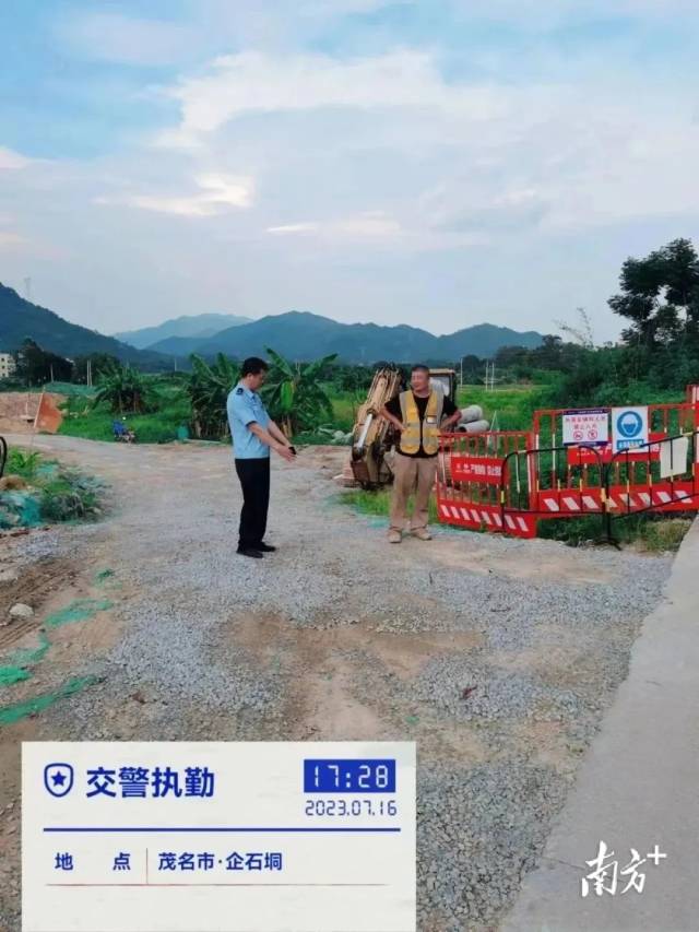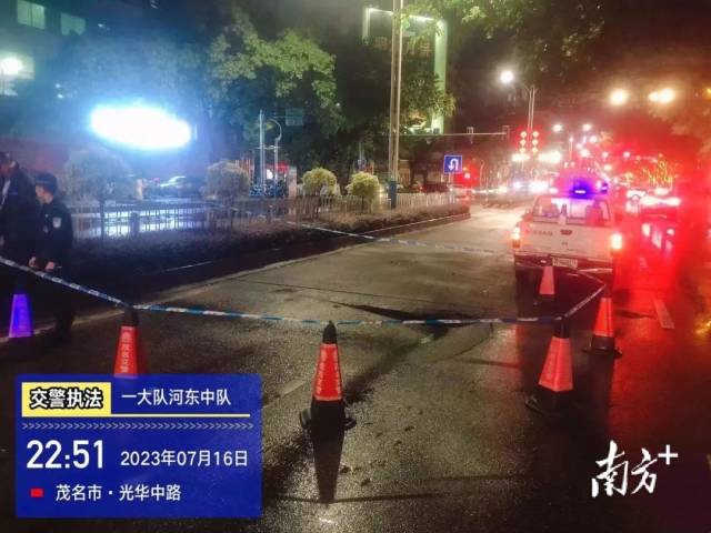 同样在当日22时许,茂名市区丰年交通岗北往南车道发现地陷,茂名交警一大队河东中队接报后,第一时间作出围闭警示处置,引导过往车辆有序通行,同时检查辖区路段的路况,是否存在安全隐患并及时清除。