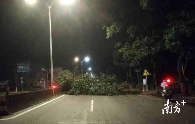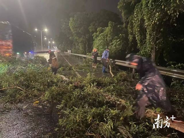 16日晚,信宜交警镇隆中队快速出警,清理被大风吹倒在207国道上的大树,恢复道路交通。
