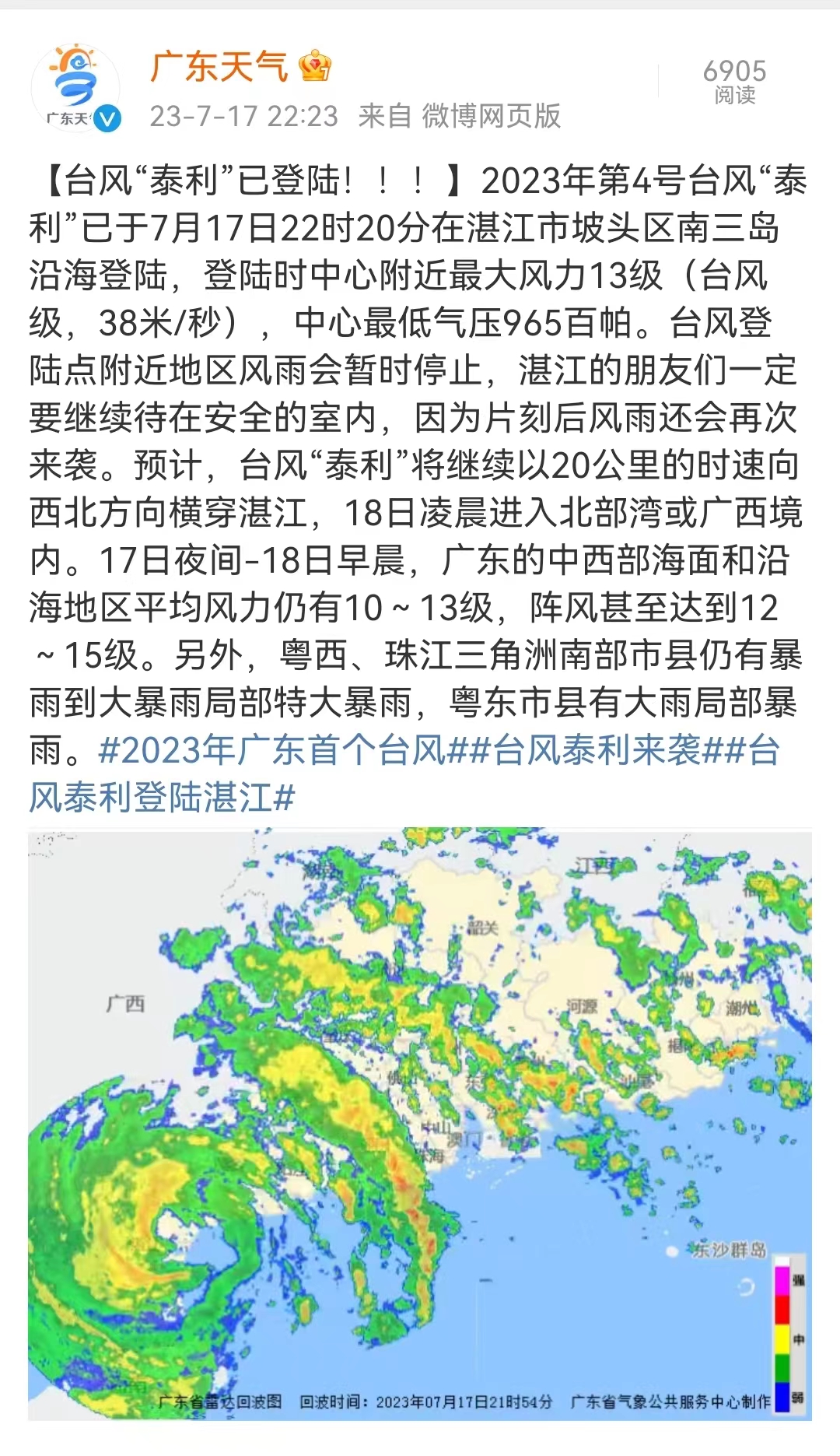 南方网讯 据广东天气官方微博消息,2023年第4号台风“泰利”已于7月17日22时20分在湛江市坡头区南三岛沿海登陆,登陆时中心附近最大风力13级(台风级,38米/秒),中心最低气压965百帕。台风登陆点附近地区风雨会暂时停止,市民一定要继续待在安全的室内,因为片刻后风雨还会再次来袭。