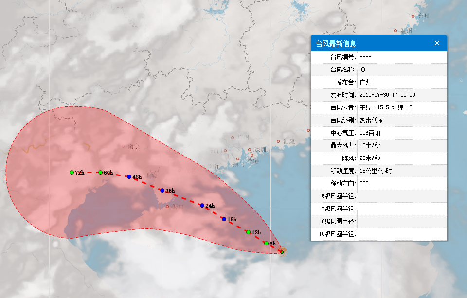 惠州气象台预计,热带低压将以20公里左右的时速向西北方向移动,强度逐渐加强,较大可能于31日夜间在电白到海南琼海一带沿海地区登陆(热带风暴级)。