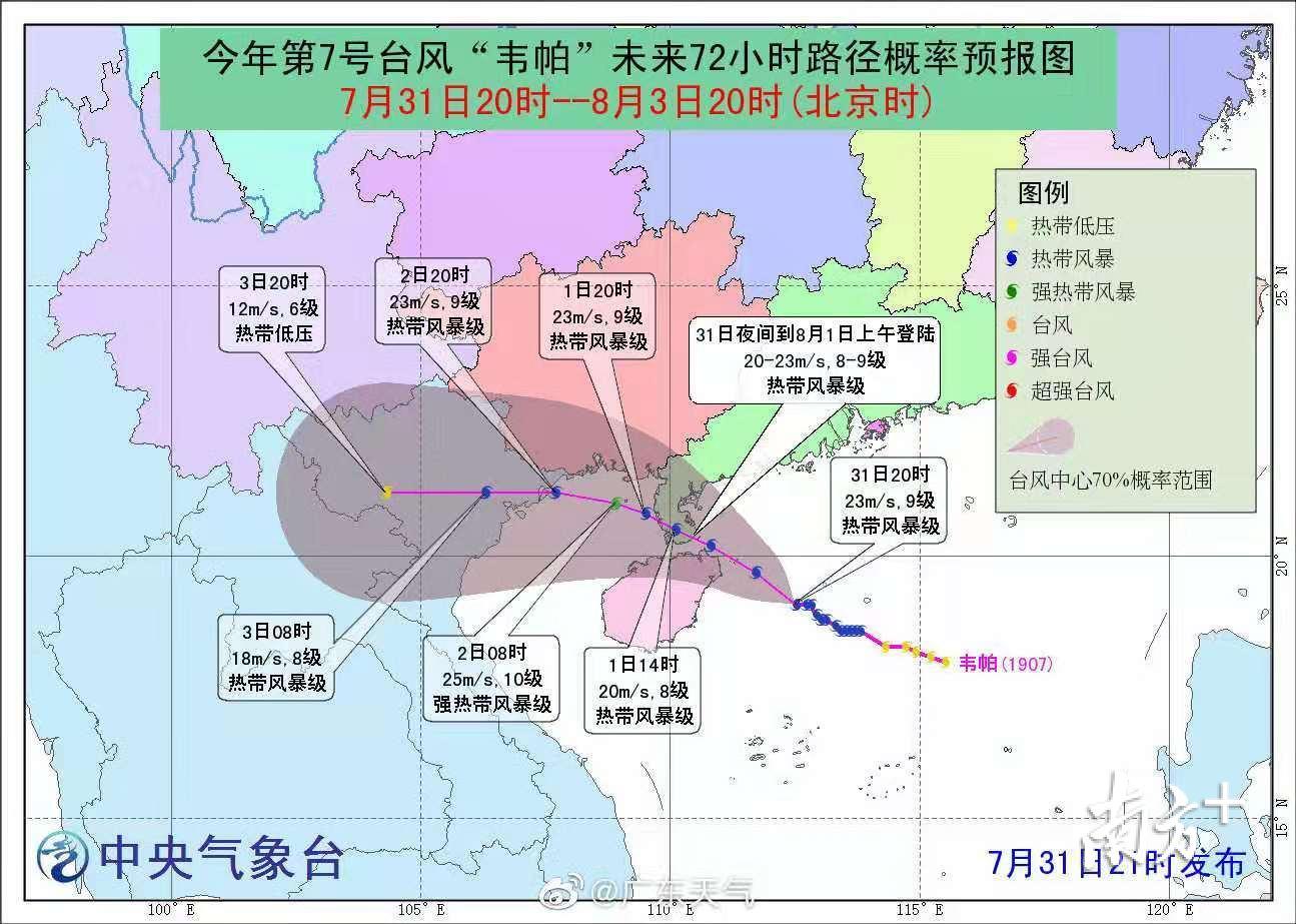 31日22时,台风“韦帕”(热带风暴级)中心最大风力9级(23米/秒),中心最低气压985百帕,中心位于海南省文昌市偏东方向约155公里的海面上,未来将以每小时18公里左右的速度向西北方向移动,将于31日半夜到8月1日早晨在电白到海南琼海一带沿海地区登陆。受台风外围云系影响,今天08时-22时,中山市普降大雨到暴雨,同时出现7至9级阵风,其中三乡马坑水库录得全市最大累积雨量85.3毫米,东区录得全市最大阵风21.2米/秒(9级)。预计今夜至明天白天,中山市仍有暴雨,局部大暴雨,沿海阵风8-9级,目前全市台风蓝色和暴雨黄色预警信号仍在生效中,请继续做好各项防御工作。中山市气象台2019年7月31日22时30分(中山市应急管理局)