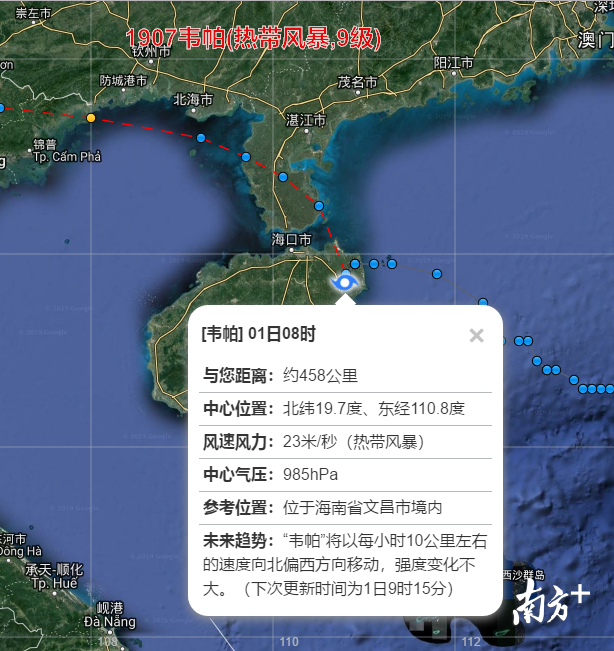 今年第7号台风“韦帕”已于8月1日凌晨1时50分在海南文昌市沿海登陆。据@广东天气,今天早晨7时,今年第7号台风"韦帕"(热带风暴级)中心位于北纬19点7度,东经110点7度,也就是海南省文昌市境内,中心附近最大风力9级,达到每秒23米的风速,中心最低气压985百帕,六级大风半径范围约480公里。预计,未来24小时内"韦帕"将以每小时10到15公里的速度向西北方向移动,将于今天中午前后在雷州半岛再次登陆。