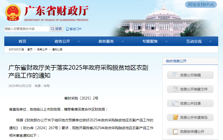 近日,广东省财政厅印发《关于落实2025年政府采购脱贫地区农副产品工作的通知》(粤财采购〔2025〕2号,以下简称《通知》)。《通知》明确,2025年我省按照不低于30%的比例预留年度食堂食材采购份额。