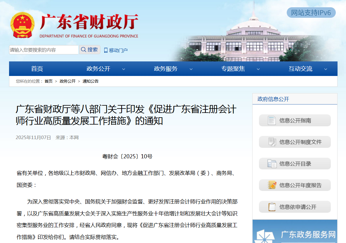 为深入贯彻落实党中央、国务院关于严肃财经纪律、更好发挥注册会计师行业作用的决策部署,报经广东省人民政府同意,省财政厅、省委网信办、省委金融办、省发展改革委、省商务厅、省国资委,广东金融监管局、广东证监局等八部门于2025年11月联合印发了《促进广东省注册会计师行业高质量发展工作措施》(以下简称《工作措施》),扎实推动广东省注册会计师行业高质量发展,全面提升注册会计师行业服务广东现代化建设能力。