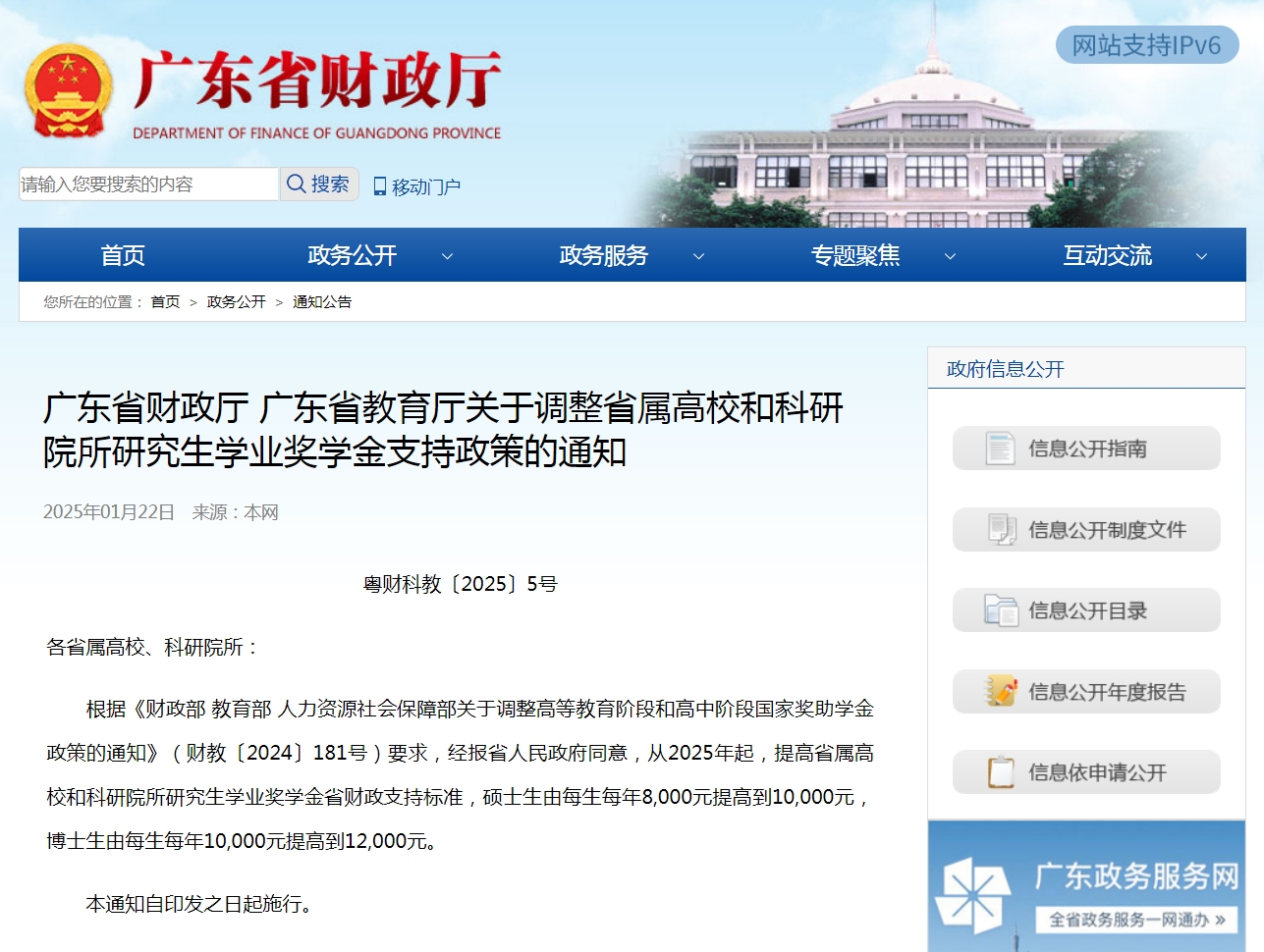近日,广东省财政厅、广东省教育厅联合印发《关于调整省属高校和科研院所研究生学业奖学金支持政策的通知》(粤财科教〔2025〕5号,以下简称《通知》)。《通知》明确从2025年起,提高省属高校和科研院所研究生学业奖学金省财政支持标准,硕士生由每生每年8000元提高到10000元,博士生由每生每年10000元提高到12000元。