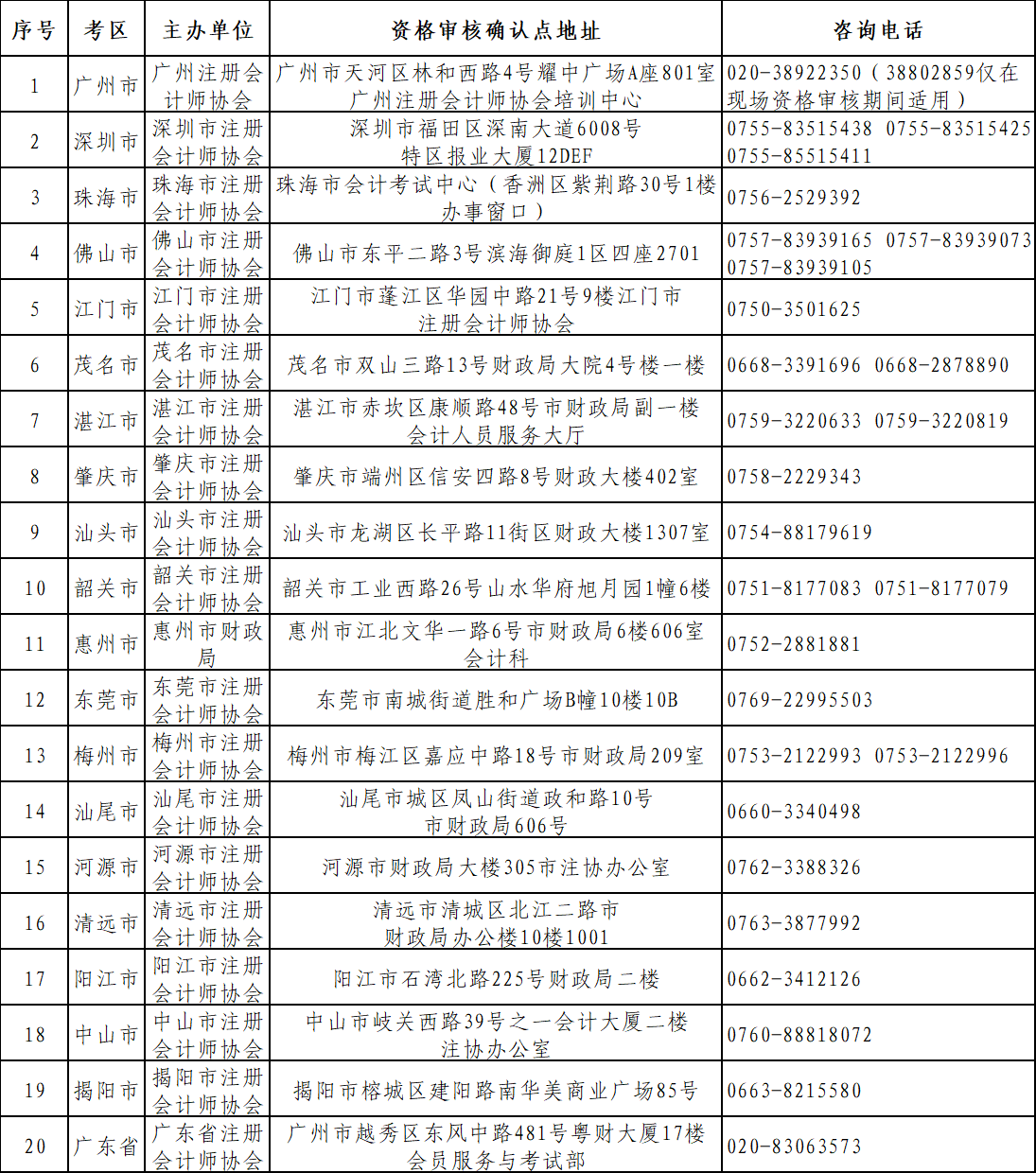 答:广东省各考区资格审核点联系方式:
