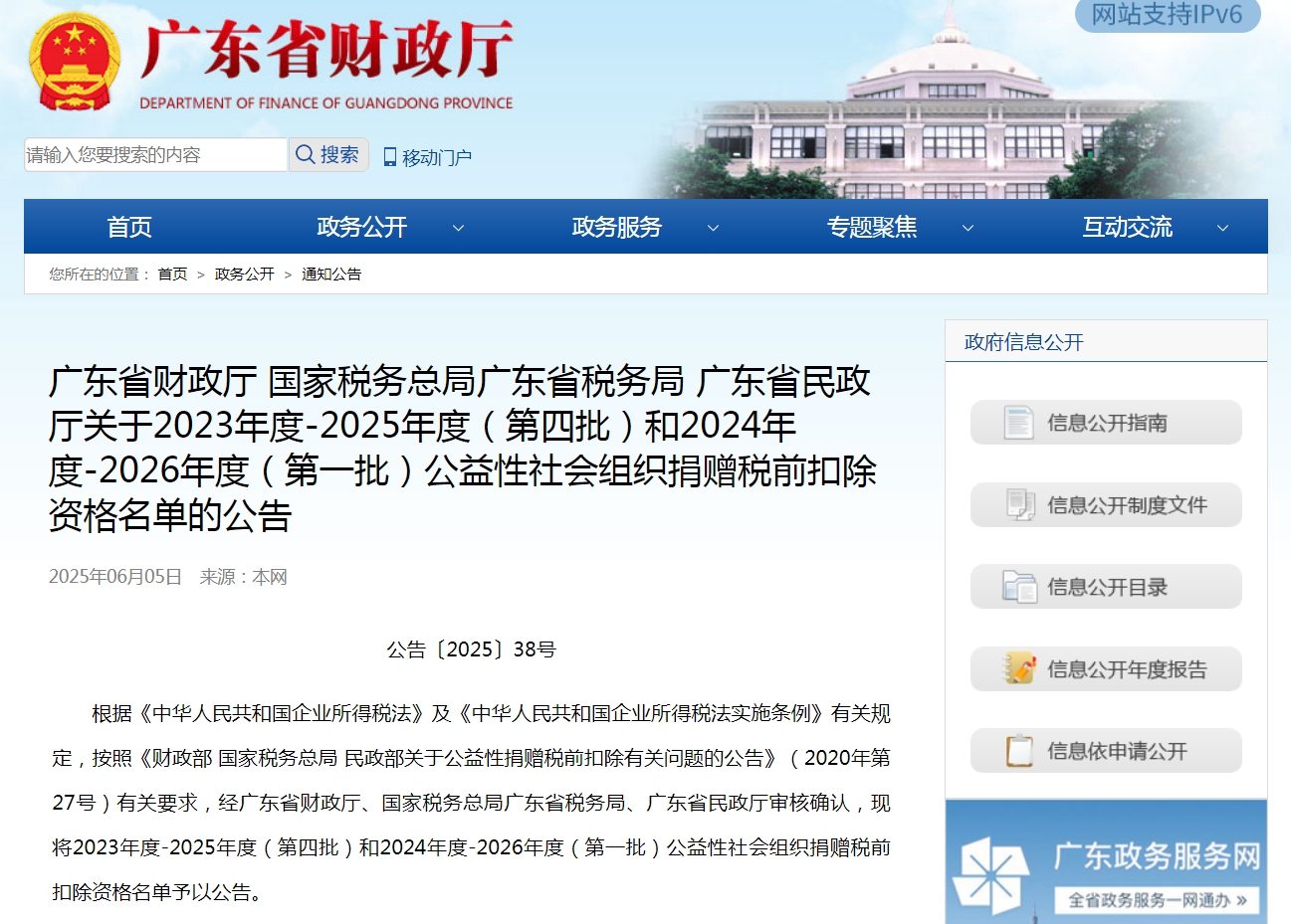根据《中华人民共和国企业所得税法》及《中华人民共和国企业所得税法实施条例》有关规定,按照《财政部 国家税务总局 民政部关于公益性捐赠税前扣除有关问题的公告》(2020年第27号)有关要求,经广东省财政厅、国家税务总局广东省税务局、广东省民政厅审核确认,现将2023年度-2025年度(第四批)和2024年度-2026年度(第一批)公益性社会组织捐赠税前扣除资格名单予以公告。