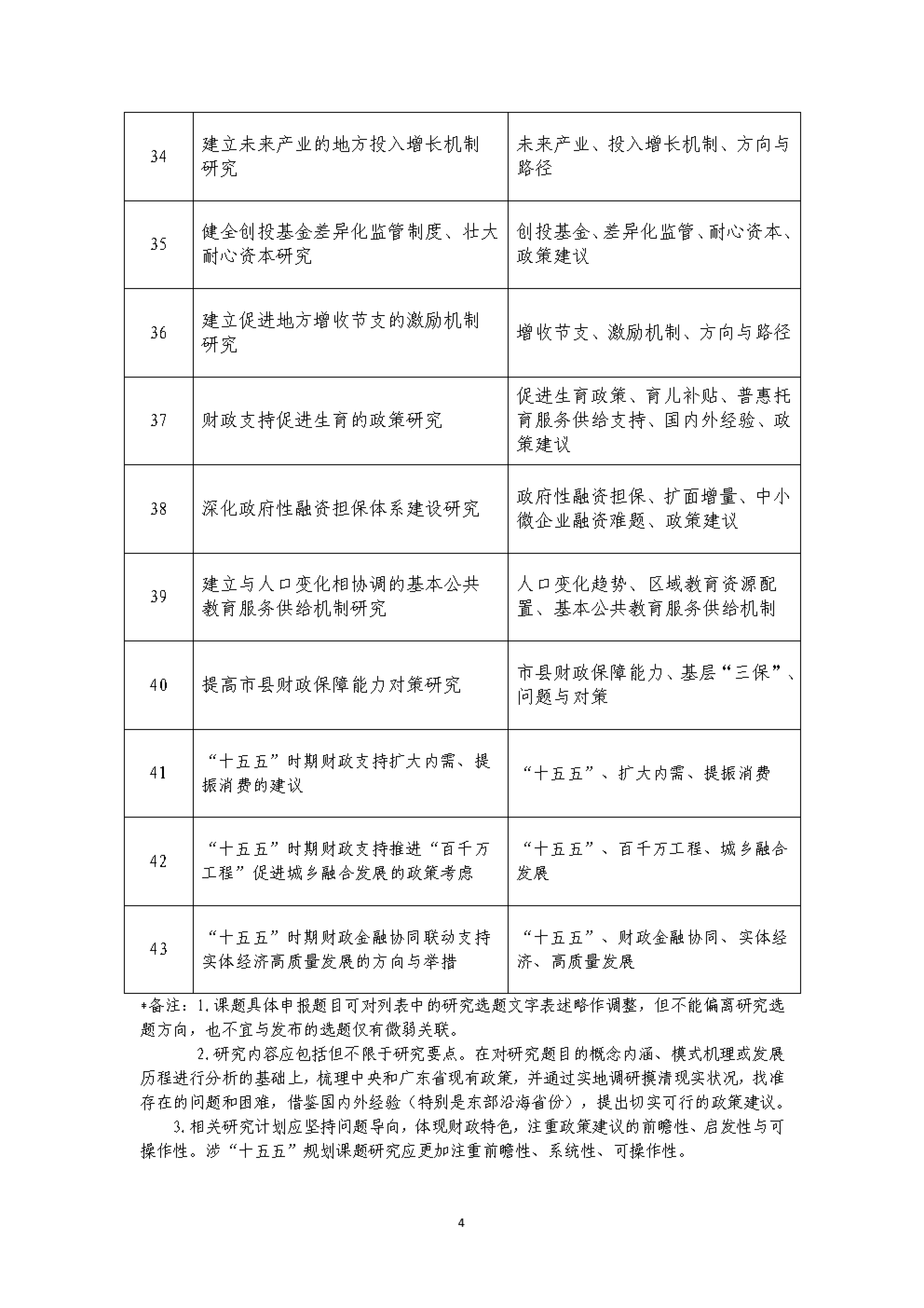 本年度课题包含43个选题,每个选题均已列明研究要点(详见附件1)。申报课题组应围绕研究选题,立足财政工作实际,结合自身研究方向,选取相应题目申报。课题具体申报题目可对列表中的研究选题文字表述略作调整,但不能偏离研究选题方向,且研究内容须涵盖全部研究要点。