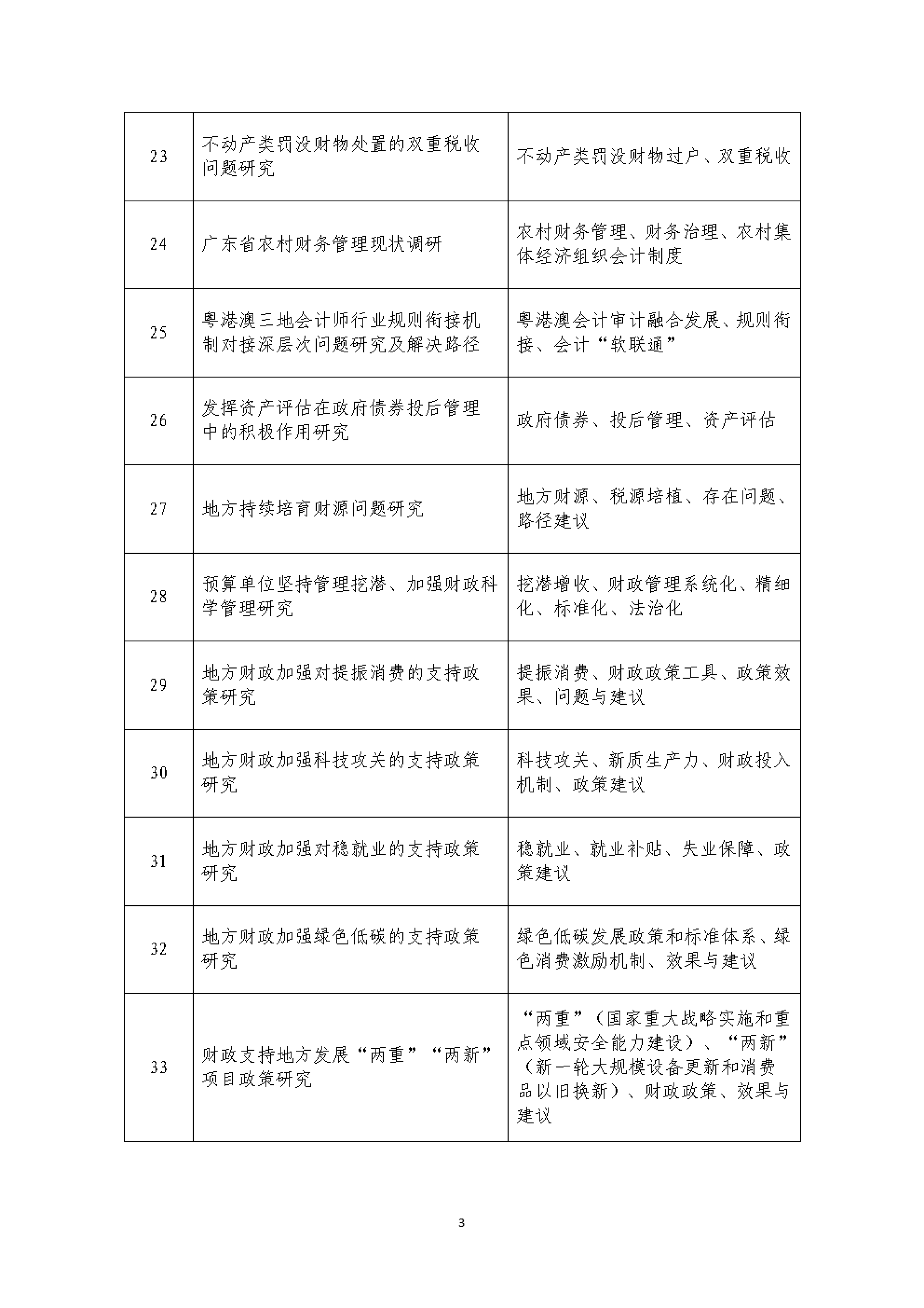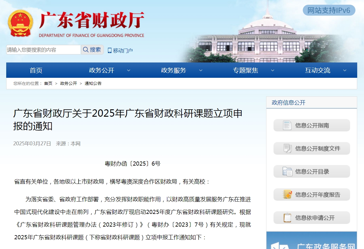 为落实省委、省政府工作部署,充分发挥财政职能作用,以财政高质量发展服务广东在推进中国式现代化建设中走在前列,广东省财政厅现启动2025年度广东省财政科研课题研究。根据《广东省财政科研课题管理办法(2023年修订)》(粤财办〔2023〕7号)有关规定,现就2025年广东省财政科研课题(下称省财政科研课题)立项申报工作进行通知。