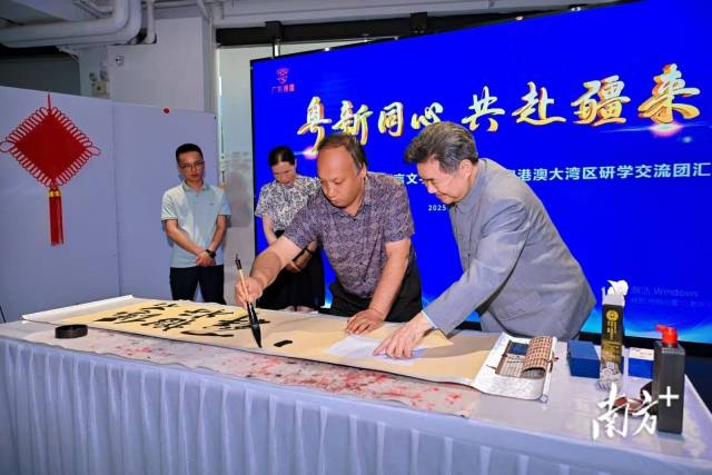 毛笔在广东演讲学会常务副会长郑宏彪与来自新疆喀什的阿卜杜凯尤木·艾萨、郑晓东、罗迎春之间传递,笔走龙蛇间,四人共同写下行书大字:“像石榴籽一样紧紧抱在一起”……9月27日,珠水之畔,随着这幅别开生面的共创书法完成,“粤新同心 共赴疆来”第二届推广国家通用语言文字系列活动赴大湾区研学迎来了尾声。