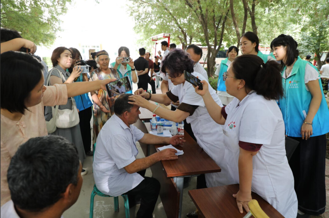 在疏附县乌帕尔镇中心卫生院,杨志敏耐心询问每位群众的病史症状,现场施以治疗的同时,还给出了日常护理的指导建议。