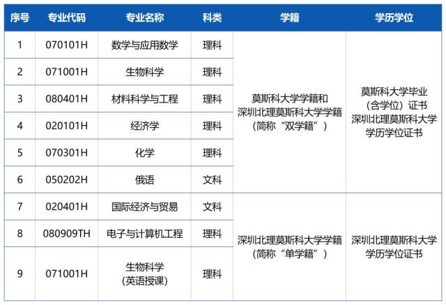 在学科专业方面,数学与应用数学、生物科学、材料科学与工程、经济学、化学和俄语为双学籍专业,为俄语授课,学生毕业时获莫斯科大学及深圳北理莫斯科大学学历学位证书;国际经济与贸易、电子与计算机工程、生物科学(英语授课)为单学籍专业,毕业时获深圳北理莫斯科大学学历学位证书。