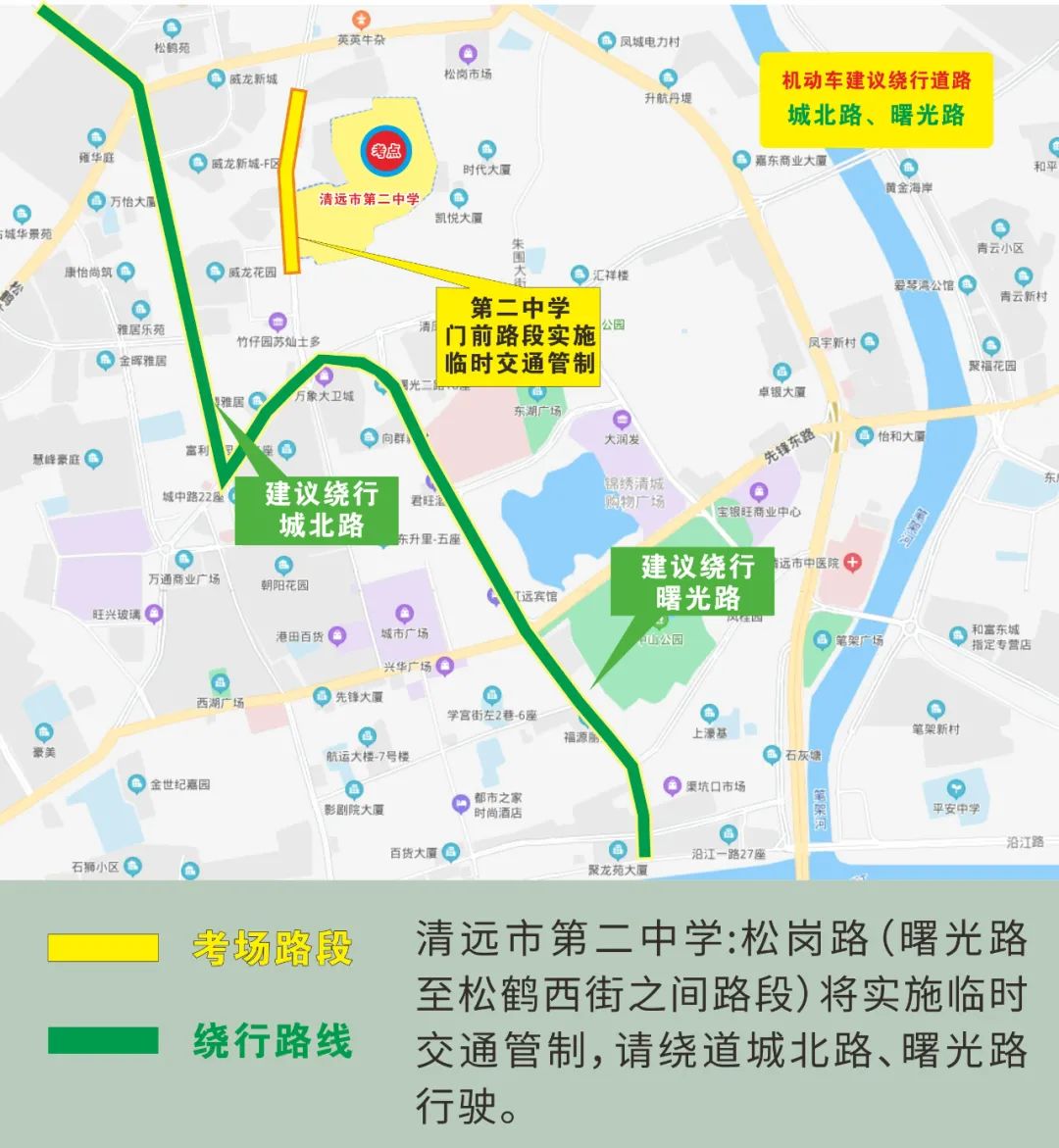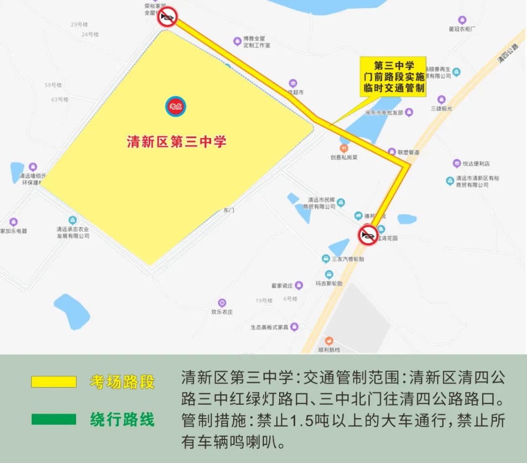 禁止无关车辆进入清新一中;环城路禁止1.5吨以上的大车通行,禁止所有车辆鸣喇叭。