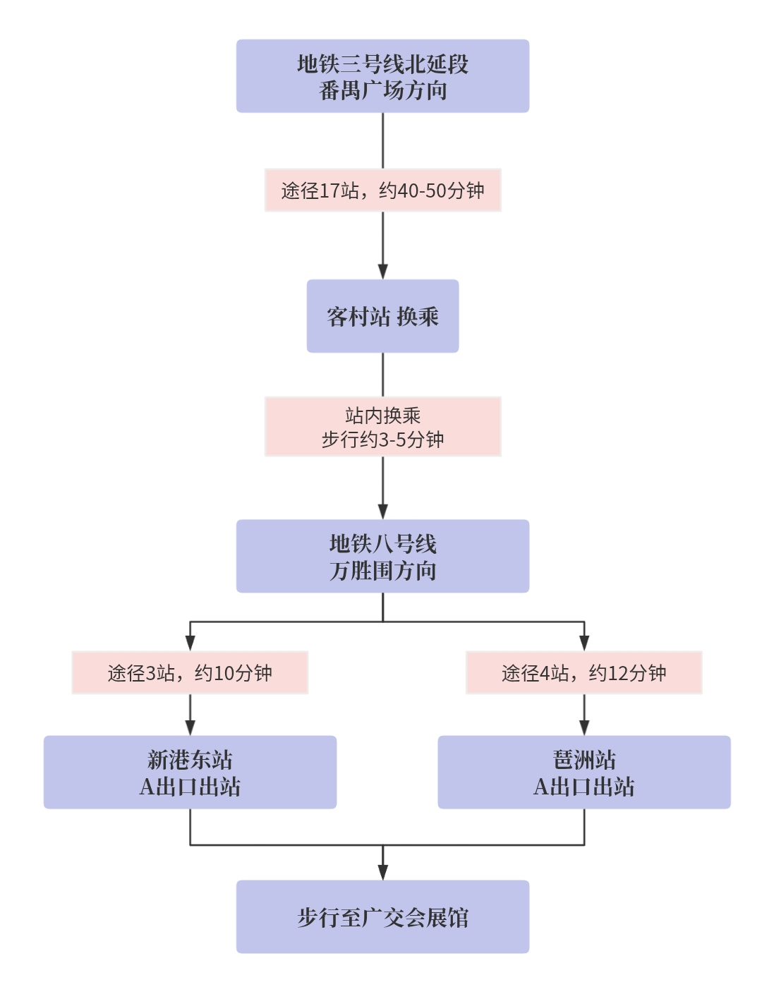 出站提示:新港东站、琶洲站均从A口出站,出站后有广交会展馆指引标识