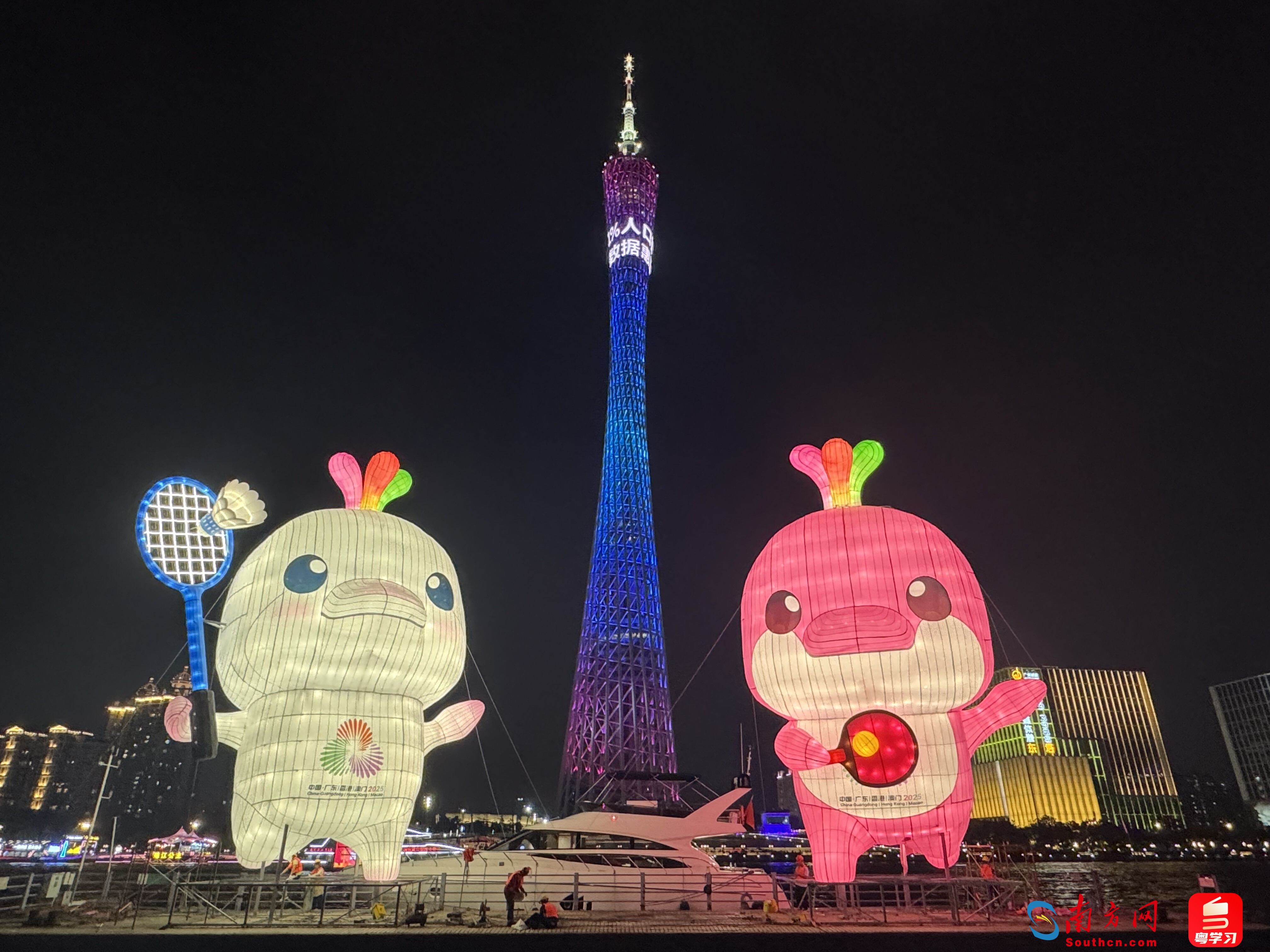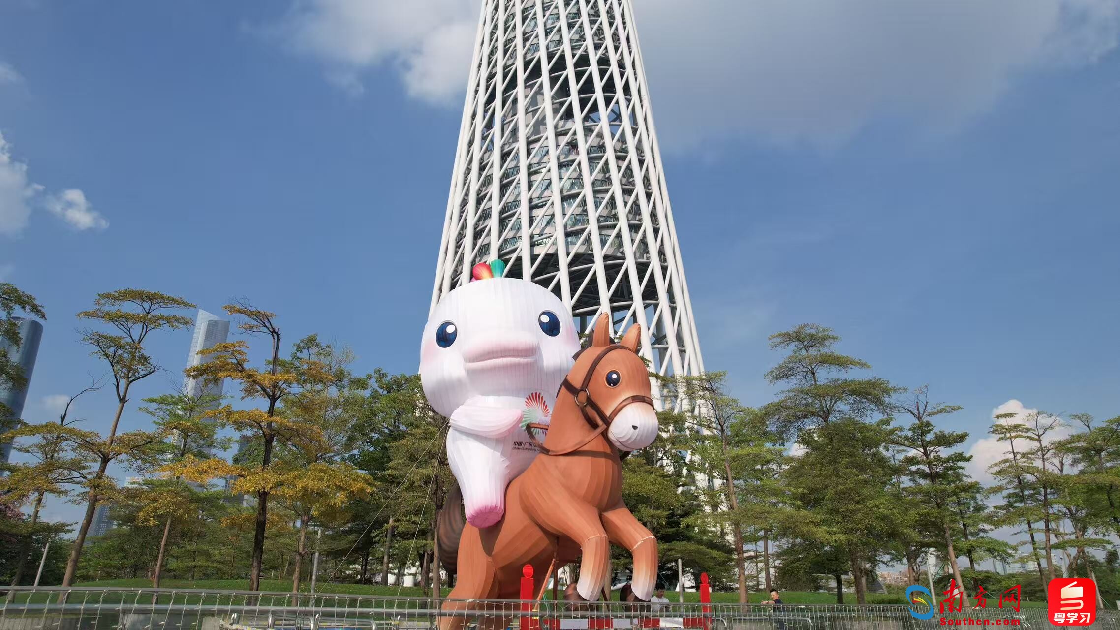 广州塔下吉祥物“喜洋洋”“马到成功”彩灯装置