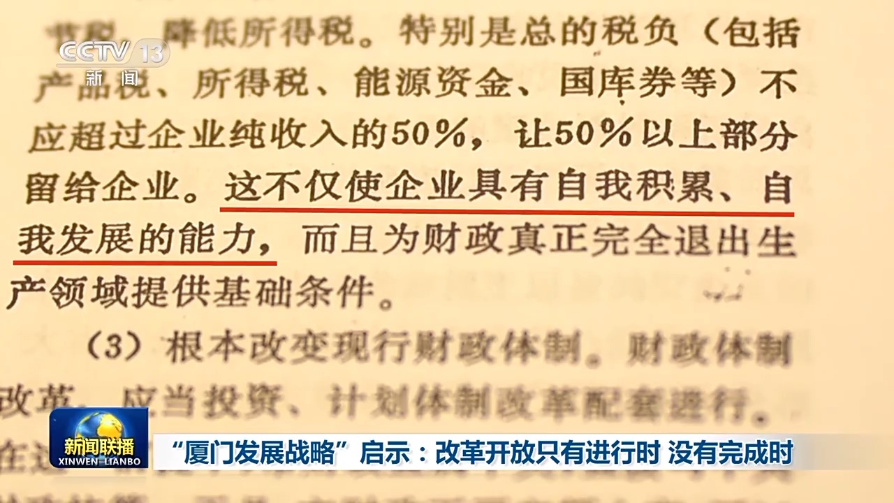 敢闯敢试、敢为人先。30多年前,时任厦门市委常委、常务副市长的习近平同志牵头组织制定了我国地方政府首部纵跨15年的发展战略——《1985年—2000年厦门经济社会发展战略》。《发展战略》以改革和开放作为总方针,推动了一系列开创性、前瞻性的战略举措,为厦门发展奠定了坚实基础。系列报道《“厦门发展战略”启示》今天播出第二集《改革开放只有进行时,没有完成时》。