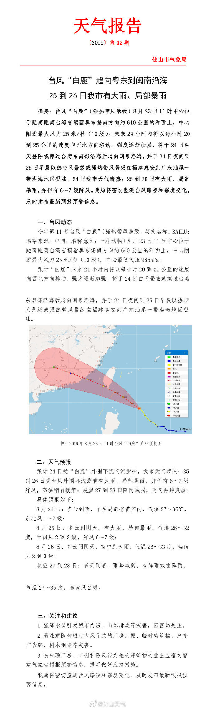 台风“白鹿”(强热带风暴级)8月23日11时中心位于距离台湾省鹅銮鼻东偏南方向约640公里的洋面上,中心附近最大风力25米/秒(10级)。未来24小时内将以每小时20到25公里的速度向西北方向移动,强度逐渐加强,将于24日白天登陆或擦过台湾东南部沿海后趋向闽粤沿海,并于24日夜间到25日早晨以热带风暴级或强热带风暴级在福建惠安到广东汕尾一带沿海地区登陆。预计24日佛山市天气晴热,午后局部有雷阵雨;25到26日受台风“白鹿”影响,有大雨、局部暴雨,并伴有6—7级阵风。佛山市气象局将密切监测台风路径和强度变化,及时发布最新预报预警信息。