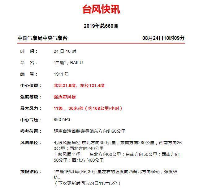 8月24日10时,今年第11号台风“白鹿”中心位于汕头市东南方约470公里的洋面上,中心附近最大风力11级(30米/秒,强热带风暴级)。预计,其将以25到30公里的时速向西北方向移动,于24日下午穿过或擦过台湾南部后趋向粤东到闽南海面,并于24日半夜到25日早晨以强热带风暴级(10到11级)在汕尾到福建漳州市之间的沿海地区登陆。预计今天受其外围下沉气流影响,中山市维持晴热天气,25-26日受其环流影响,中山市有中到大雨局部暴雨降水,请做好相关防御措施。