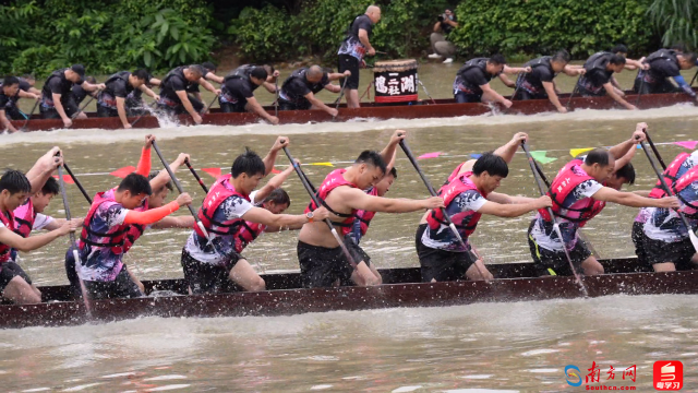 5月29日,广州市白云区人和镇流溪河鸦湖河段锣鼓喧天。作为白云区“百千万工程”的重点文化项目,人和镇“百舸争流 龙兴人和”龙舟文化活动在此开展。19条传统龙舟劈波斩浪,在滂沱“龙舟水”中上演速度与激情的竞渡盛宴,吸引众多群众冒雨观赛,共同见证传统文化与现代发展的激情碰撞。