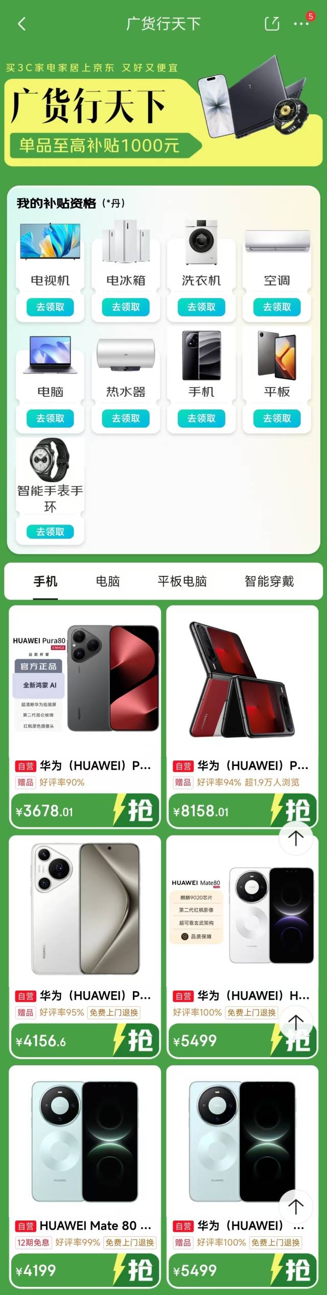 在京东方面,据记者搜索发现,“广货行天下”活动专区已经进行测试,即将正式上线。记者在京东“广货行天下”活动专区看到,平台为各式各样的“广货”提供了单品至高1000元的补贴。覆盖了手机、电脑、平板电脑、智能穿戴等多个品类,为消费者提供了丰富的“广货”选择。