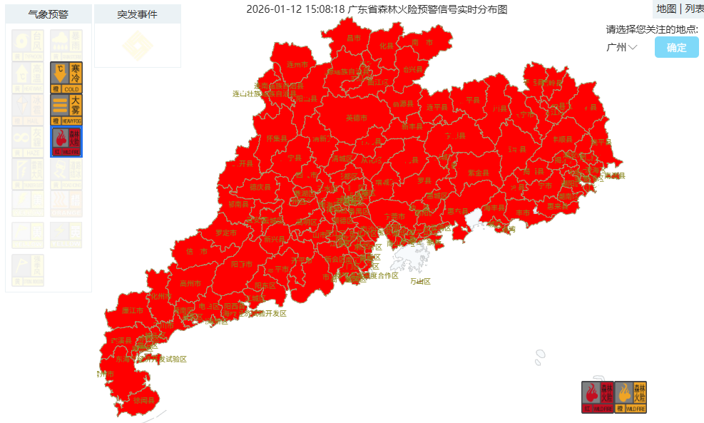 截至1月12日15时左右,广东所有县区均发布森林火险红色预警信号,高火险天气极易引发森林火灾。