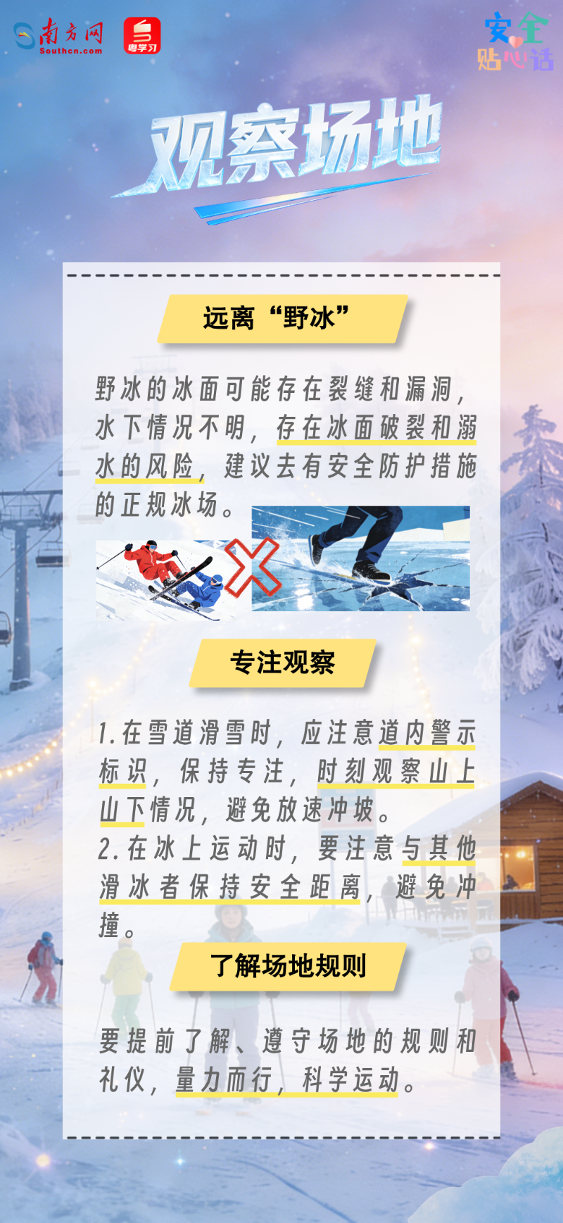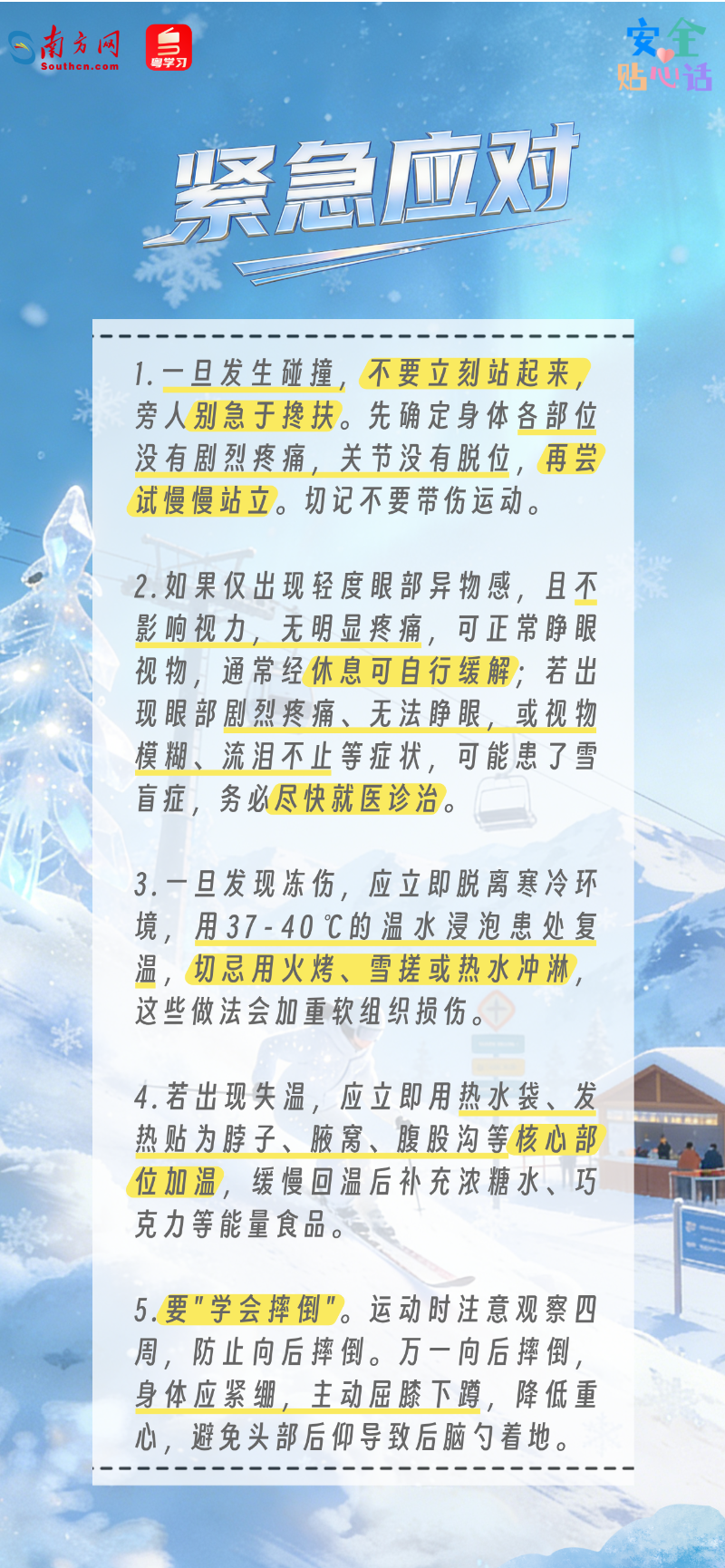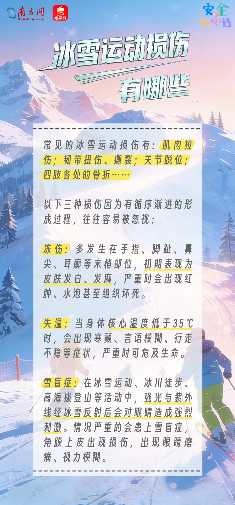 随着全国大众冰雪季的全面启动和寒假的到来,冰雪运动进入一年中最火热的时期。广东的“小土豆”们不仅热衷于北上远赴冰雪运动场地,在广东省内参与冰雪运动也热情高涨,位于深圳的世界最大室内滑雪场自去年9月试营运以来,人气屡创新高。然而,在不了解冰雪运动的情况下就盲目上场参与,极容易受伤,因此“雪道尽头是骨科”的梗一度在社交媒体爆火。对不熟悉冰雪天气户外运动的南方“小土豆”而言,参与冰雪运动尤其需要注意安全。