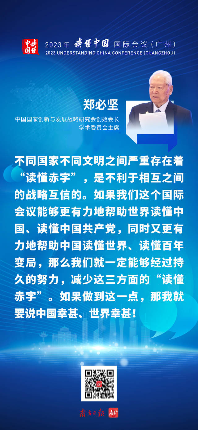 12月2日上午,2023年“读懂中国”国际会议(广州)举行开幕式。中国国家创新与发展战略研究会创始会长、学术委员会主席郑必坚在会上发布主旨演讲。