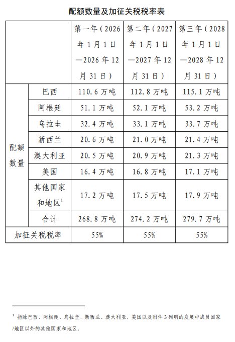 答:对进口牛肉的保障措施将于2026年1月1日起实施。自保障措施实施之日起,如进口数量未达到年度配额数量,进口牛肉将适用现行关税税率。当进口数量达到了年度配额数量的第3日起,将在现行适用关税税率的基础上加征关税。上一年度内未使用完的配额数量不结转至下一年度。