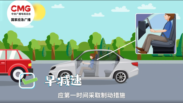 早示意:减速的同时打开危险报警闪光灯,第一时间把危险信号传递给其他车辆。