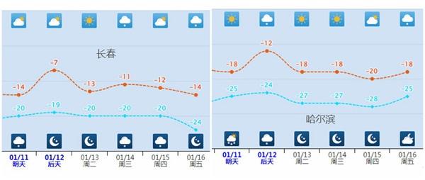 东北地区冷空气频繁影响,且降雪也比较频繁,今后7天气温总体较常年同期偏低,三九严寒本色尽显。像长春,明起6天有5天最高气温都在-10℃以下,哈尔滨最高气温也大多维持在-18℃上下。