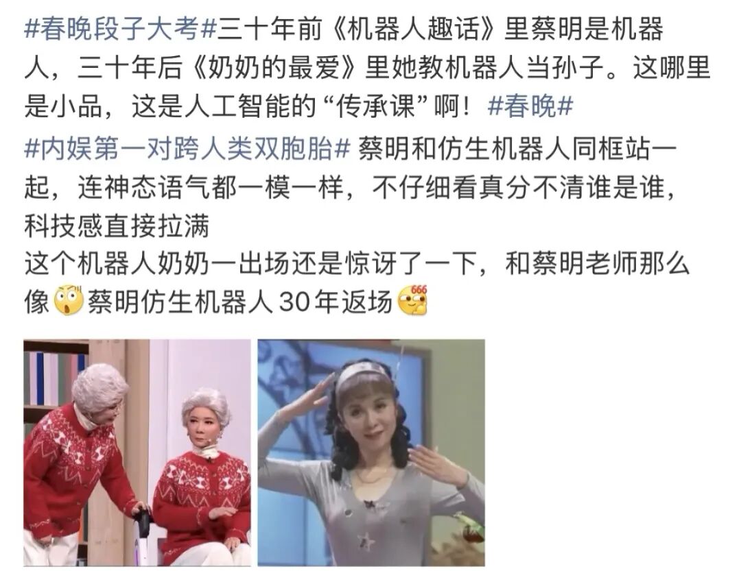 由于仿生奶奶外形过于逼真,候场时的待机状态,常被其他演员误以为是蔡明本人正在默戏。节目播出后,真假难辨的仿生奶奶直接引发热议,而“机器陪伴人类,生活多点滋味”的观感,更让大家搜起同款,考虑下单。